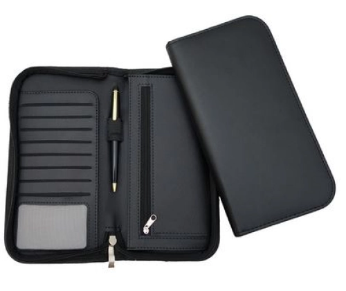 Clapham PU Deluxe Zipped Travel Wallet , finished in black leather look PU, with an excellent Deboss quality. Foil blocked, printed or full colour personalisation is also available. Product features include a soft touch leather look cover, Zip to close with a chrome zip pull, Internal pocket for documents & boarding passes, Slots pockets for health or credit cards, Business or ID Card Pocket, Pen Loop, Zipped compartment for currency, Long pocket to secure passports.