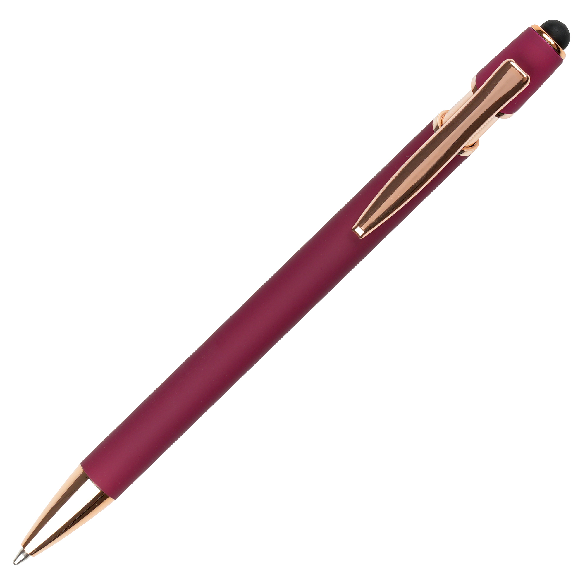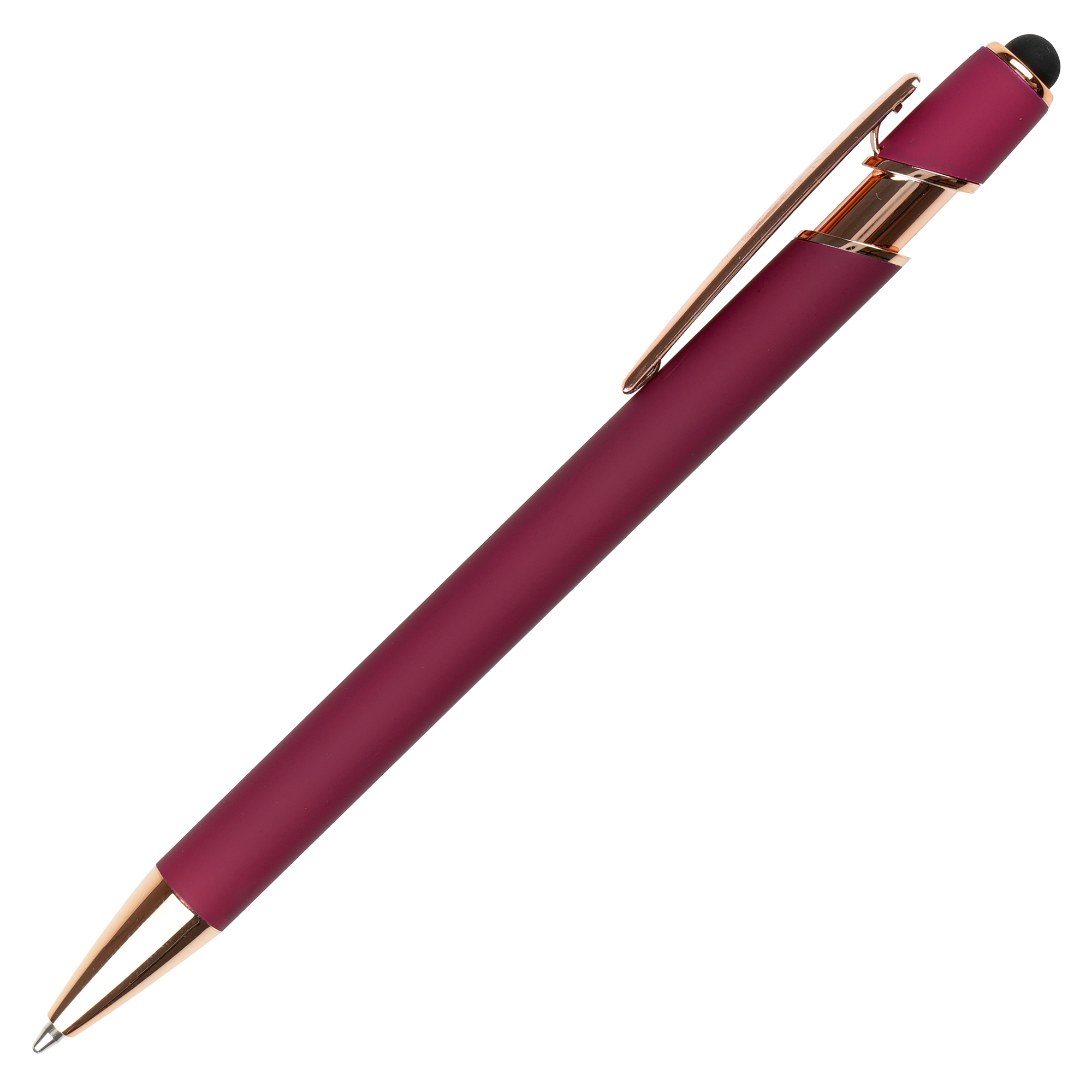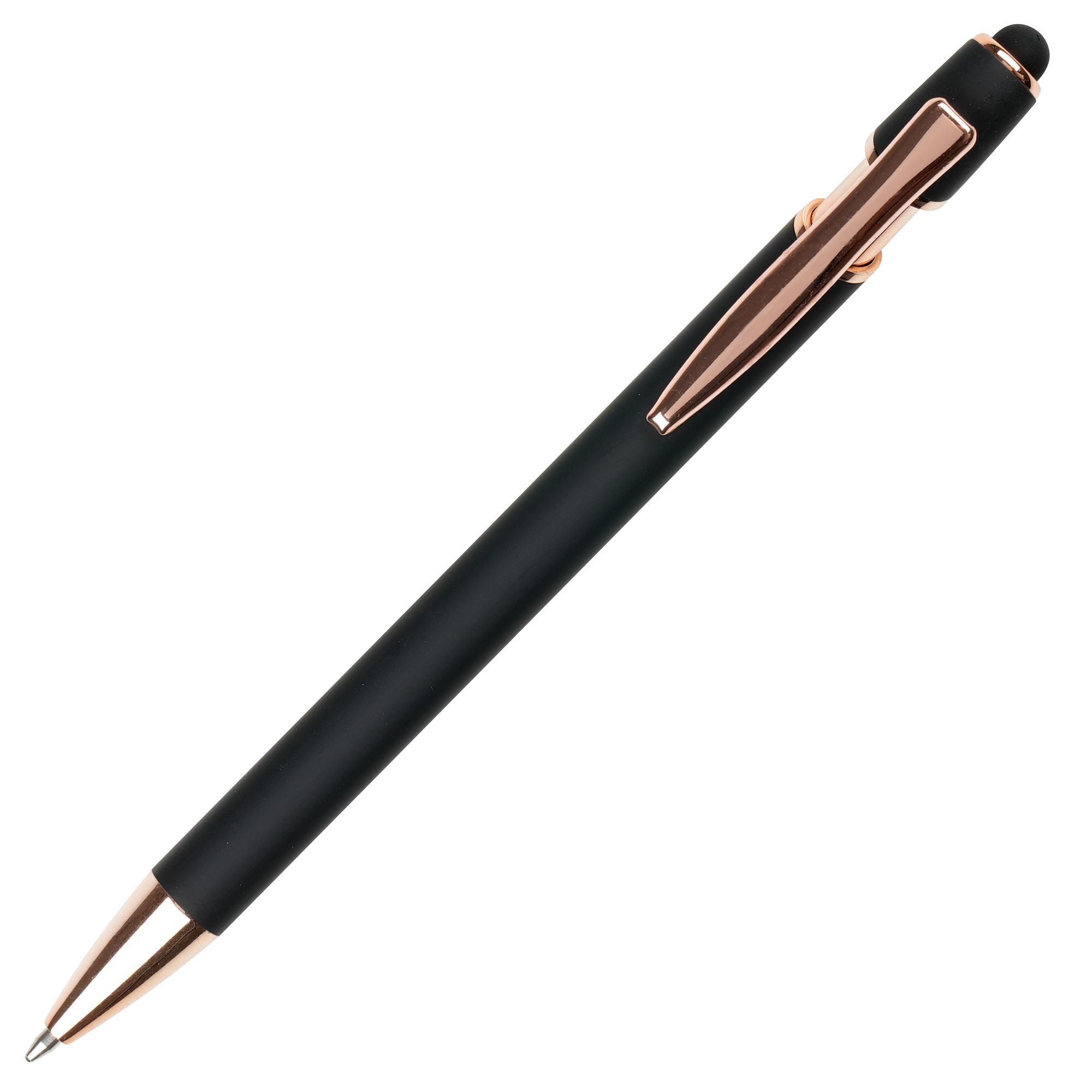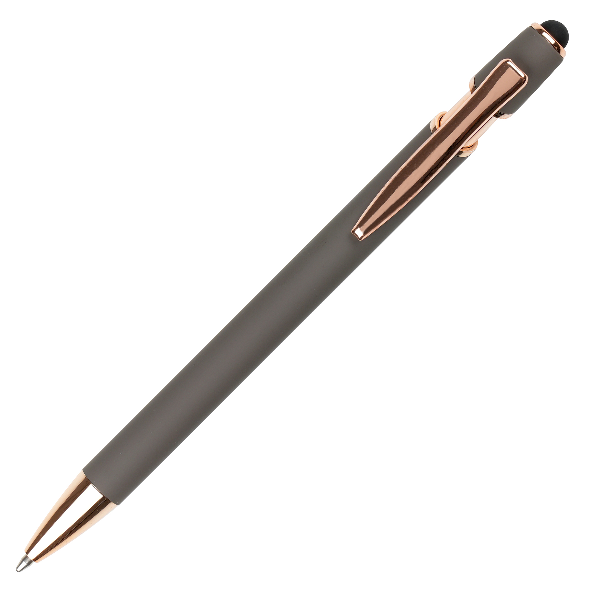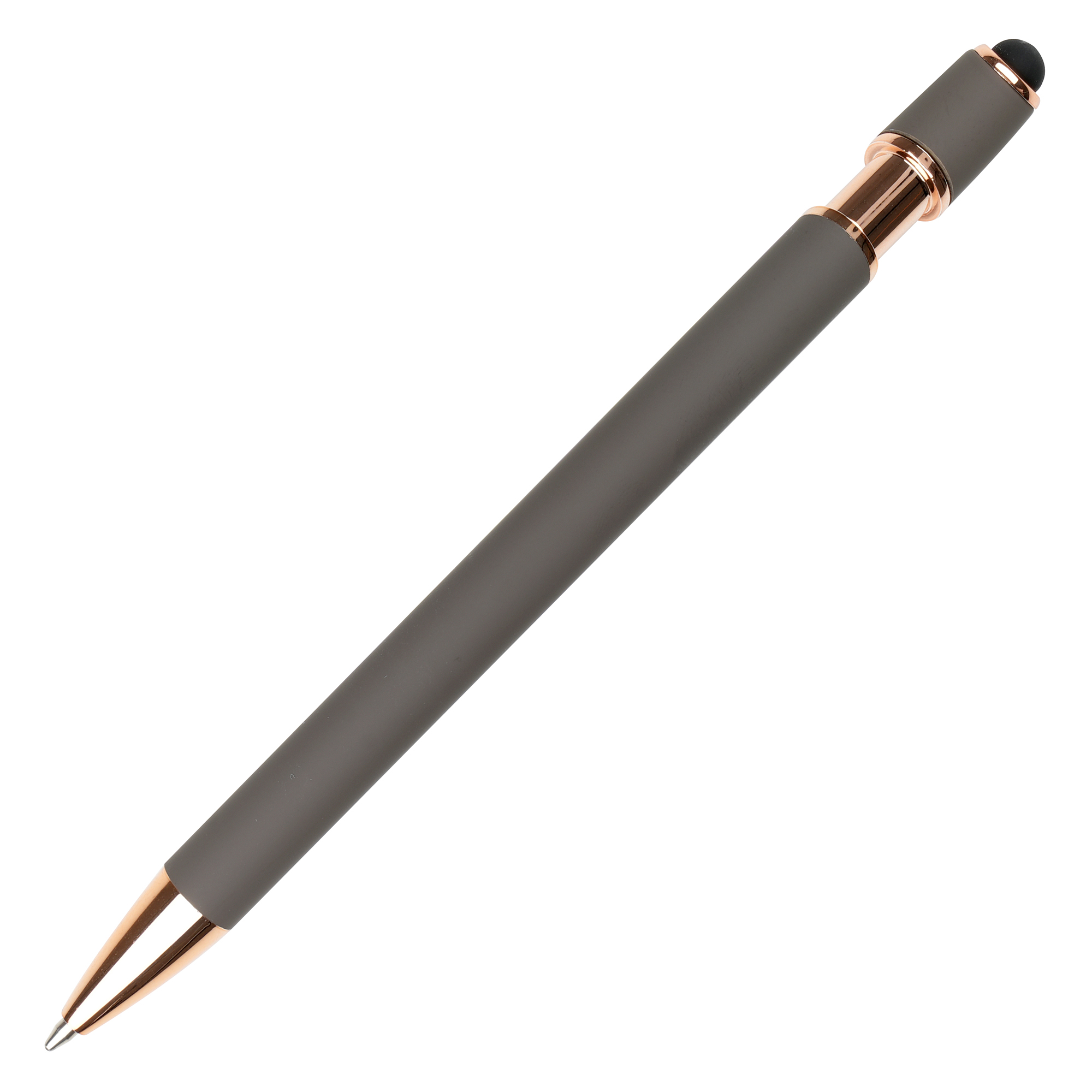 A sleek modern design in this soft feel ball pen with rose gold trim and stylus. Undercoated for a rose gold engrave finish.