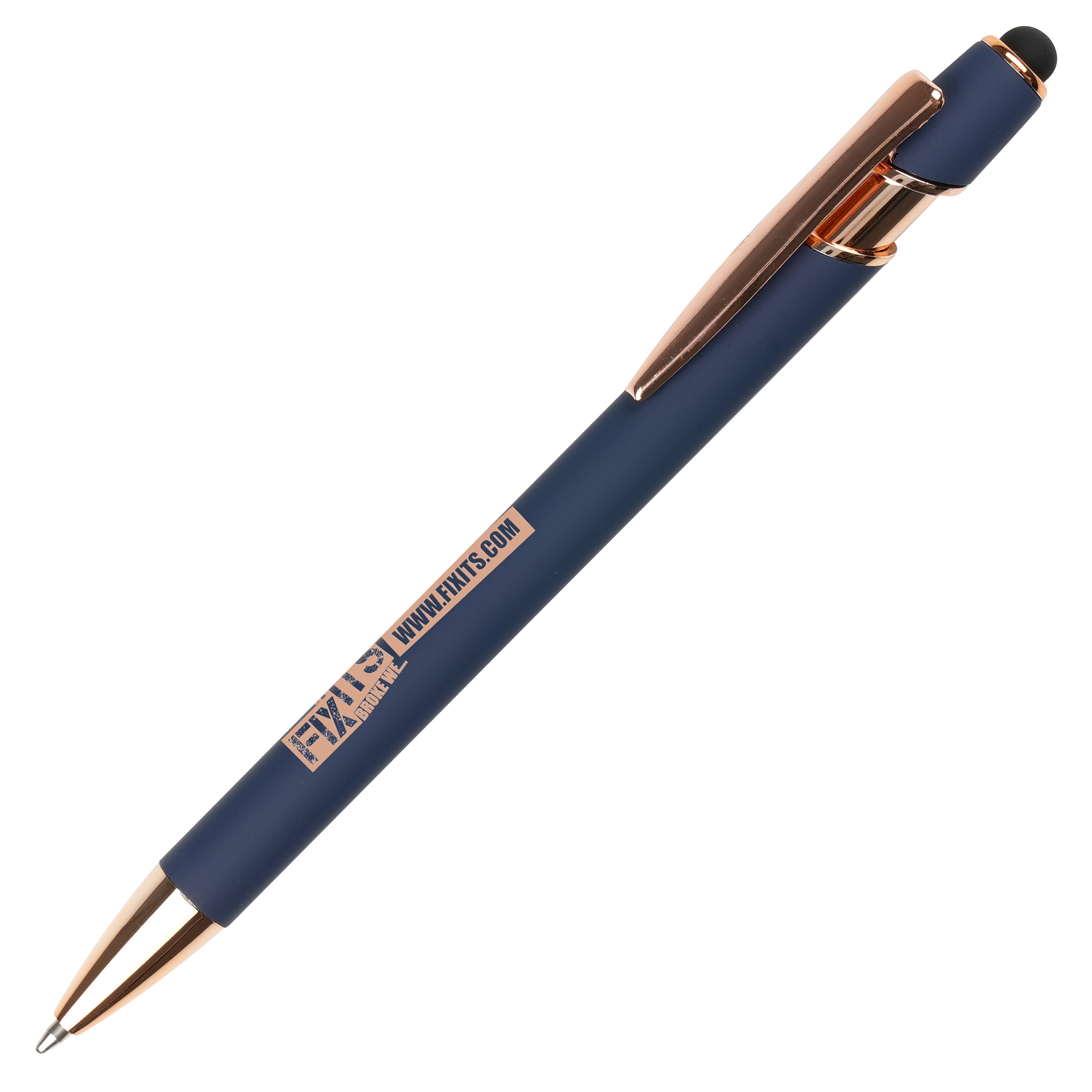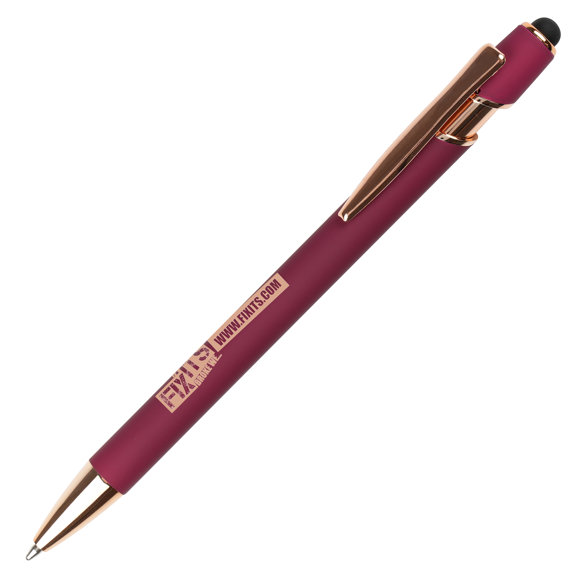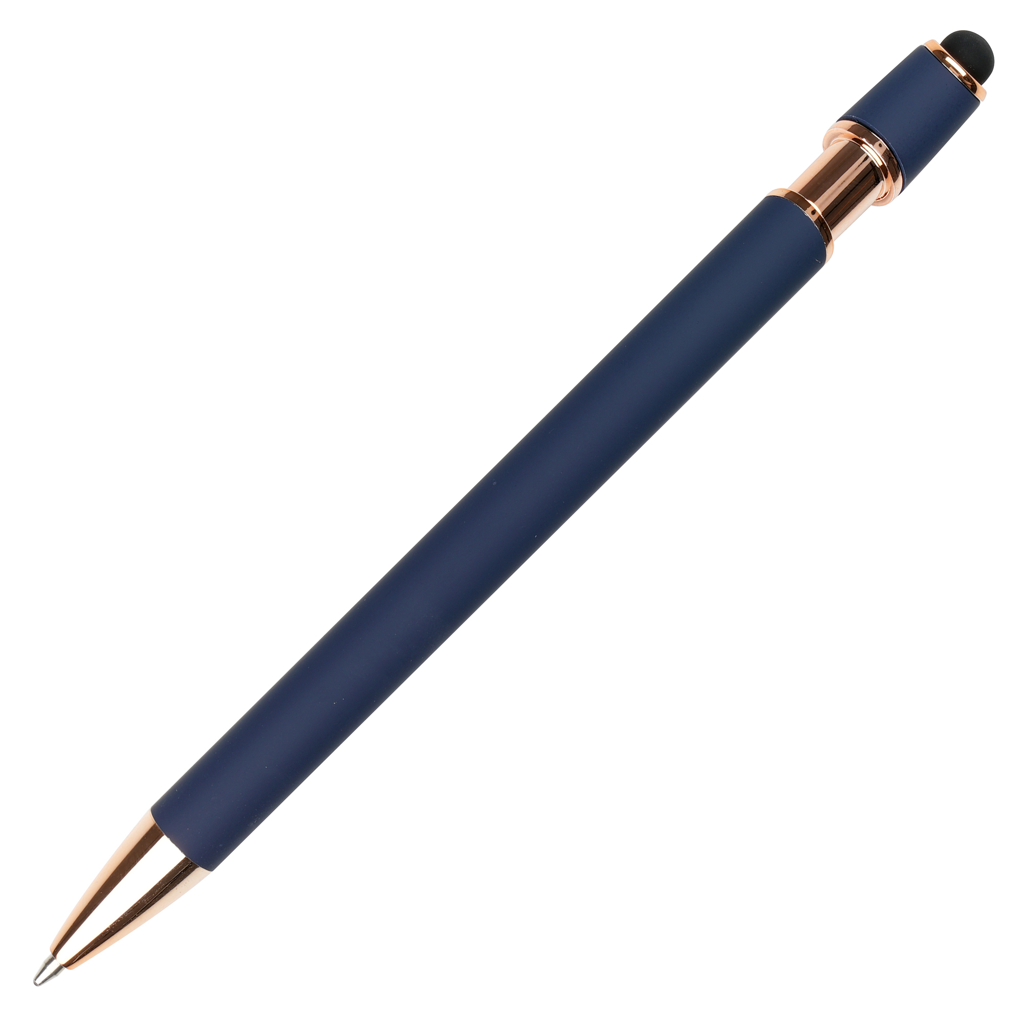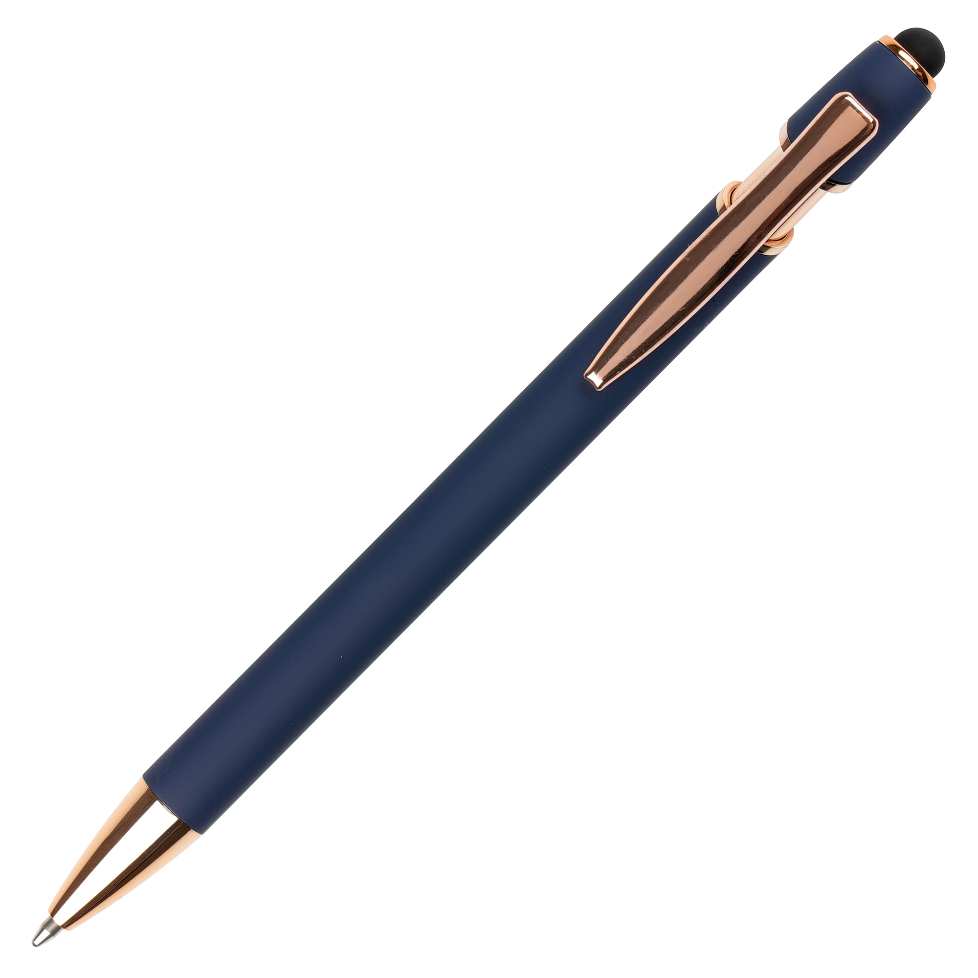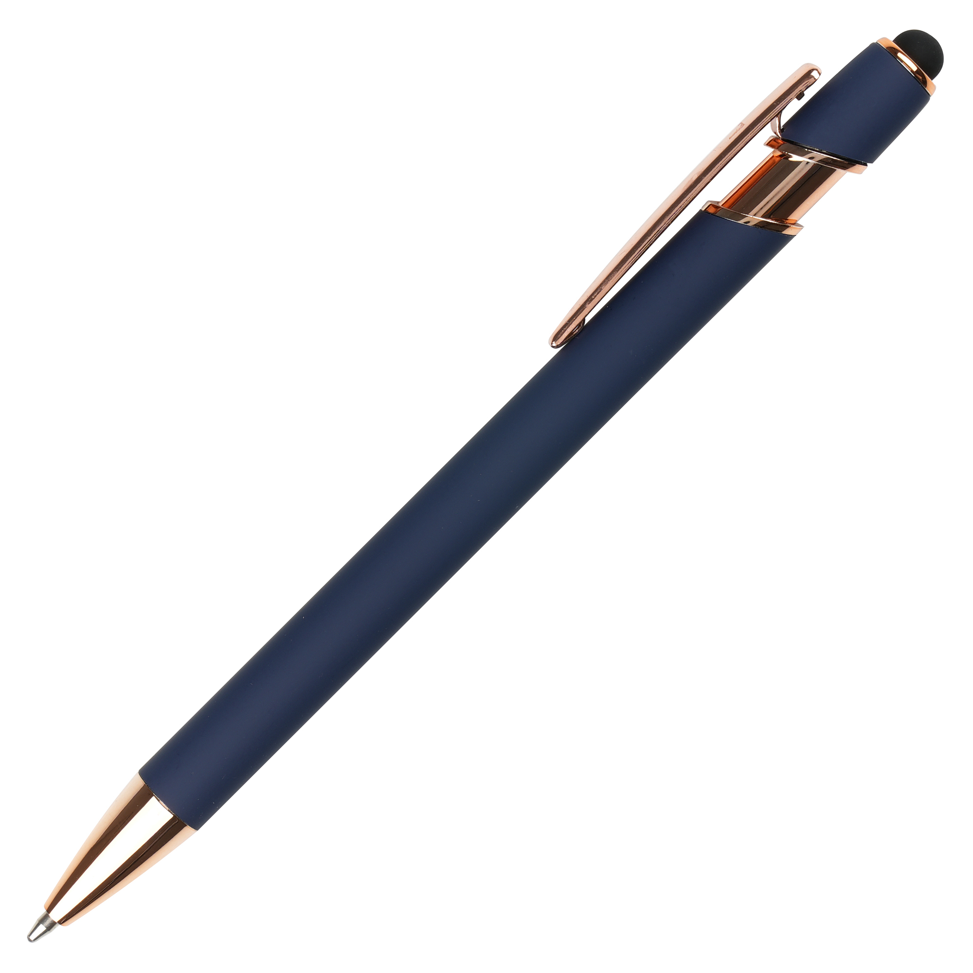 A sleek modern design in this soft feel ball pen with rose gold trim and stylus. Undercoated for a rose gold engrave finish.