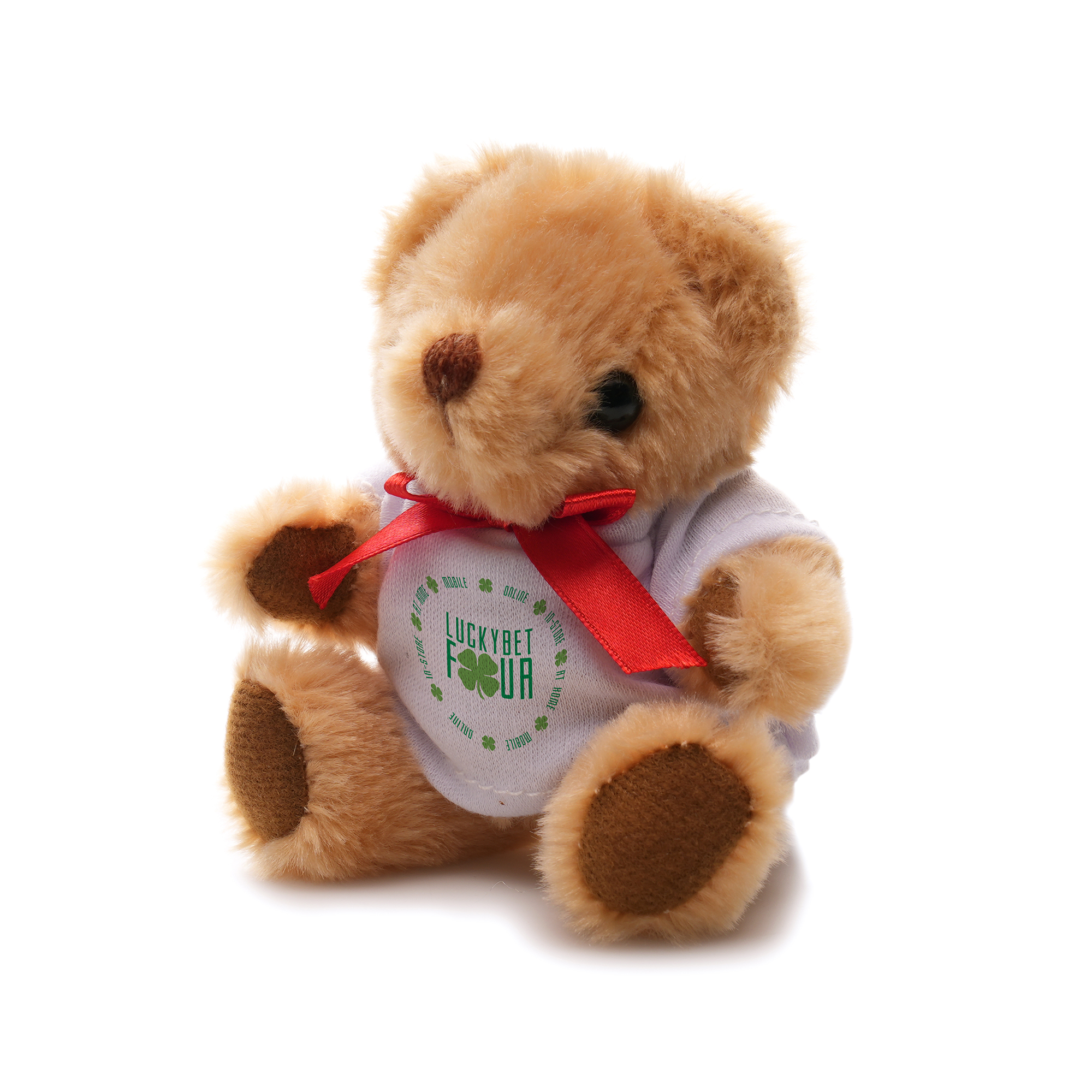 Crafted with polyester fabric and red ribbon neck tie, this 13cm teddy bear comes with moving arms and lets, cotton filler, embroidered thread nose and mouth, plastic eyes adding a real element and white t-shirt for branding. (Stock TB0004CN - Teddy, TB0104WH - T-Shirt)